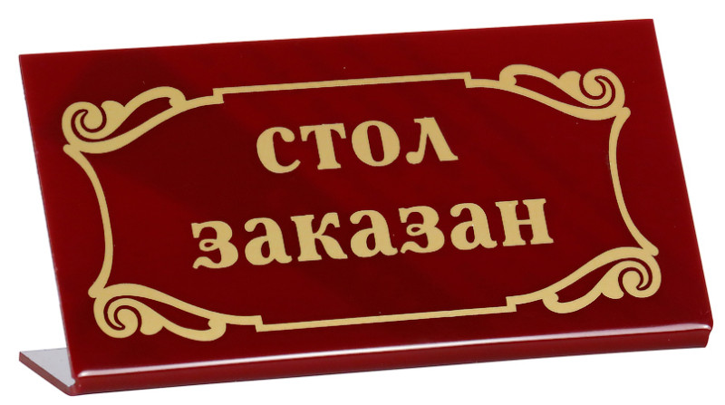 Табличку «Стол заказан» 200х100 мм можете купить в Набережных Челнах в магазине приборов, посуды и оборудования для ресторанов Челны-Хорека. Заказывайте онлайн на сайте или звоните по телефону 8 (804) 700-40-43. Доставка по всей России.