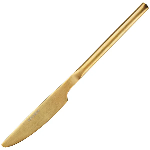 Нож бренда Kunstwerk из серии Sapporo привлекает внимание матовой поверхностью и золотым цветом. Его деликатный блеск подчеркивает премиальное качество прибора. Изготовлен из нержавеющей стали, содержащей 18% хрома, предназначен для интенсивного использования в HoReCa.